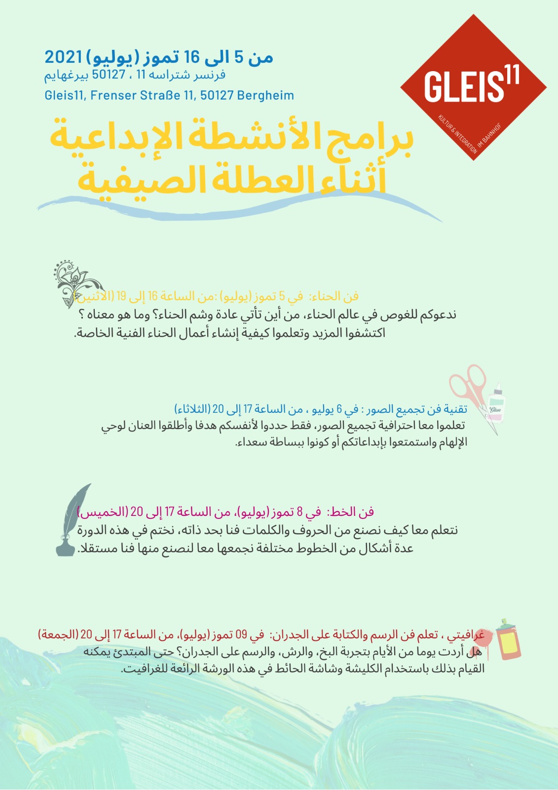 Freuen Sie sich auf die Kunst von Henna, die Gestaltung eigener Collagen, die Vielfalt des Handletterings, die Freiheit von Graffiti, einem Mal- und Smartphonefotografieworkshop sowie Einblicke ins Theater und die Zirkuskunst!
