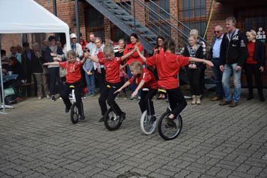 Immer wieder sorgten die neuen Bilder auf den elektronischen Bilderrahmen für Gesprächsstoff. „Haben Sie Bilder von der Radmannschaft von 1958? Hier fuhr mein Vater mit“ wurde Astrid Machuj, die für die Organisation zuständig war, gefragt. Günter Quester, Ehrenvorsitzender des Radvereins „Freie Bahn Oberaußem“, stellte die Vereinsgeschichte vor. Sein Bericht, dass es früher keine Seltenheit war, dass die Sportler auf dem Einrad bis nach Köln gefahren sind, dort den Wettkampf bestritten und auf die gleiche Weise wieder nach Hause fuhren, sorgte für ordentliches Schmunzeln, denn man machte sich Gedanken darüber, dass die Teilnehmeram nächsten Tag wohl kaum noch sitzen konnten.