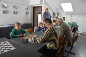 „Du musst einen Zaun aufbauen, das klappt mit zwei Bauern noch richtig gut“ erklärt Vereinsmitglied Ivan der 7-jährigen Eva, die mit großem Interesse den Erklärungen des Profis folgt. Als es dann hieß: noch ein Zug und Du kannst mich „Schach matt“ setzen, konnte man förmlich sehen, wie sehr sie ins Grübeln kam. In der unteren Etage schauten sich einige Besucher interessiert einen Film zur Tour de France an.