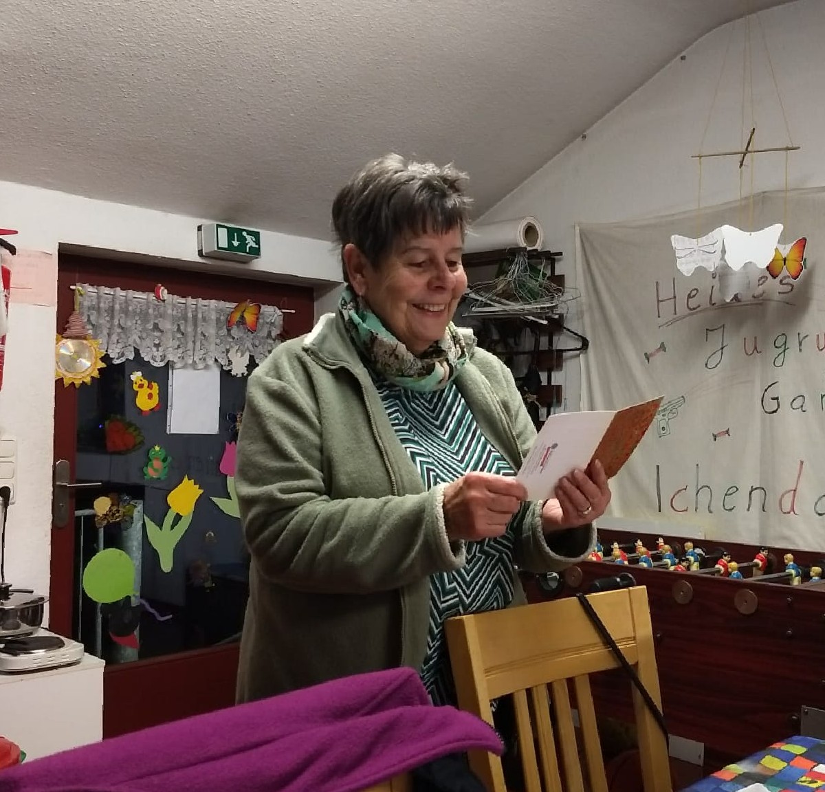 Den Raum oberhalb der Kirche hat sie vor 30 Jahren mit Hilfe der Jugendlichen gestrichen und nach und nach durch Möbelspenden eingerichtet.