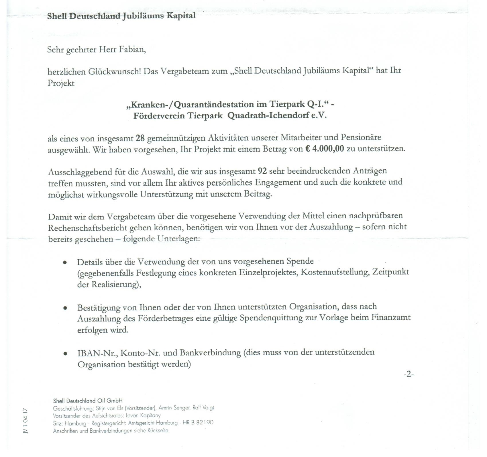 es gibt erfreuliches zu berichten. Unser Mitglied Peter Fabian, ehem. Mitarbeiter der Shell Deutschland Oil GmbH, hat einen Antrag zur Förderung unserer Kranken-/Quarantänestation im Rahmen der Aktion „Shell Deutschland Jubiläums Kapital“ gestellt. Hier werden gemeinnützige Aktivitäten der Mitarbeiter gefördert. Ähnlich wie bei Innogy (ehem. RWE) „Aktiv vor Ort“. Gemeinsam haben den Antrag so formuliert, dass eigentlich nur eine Zusage möglich war.